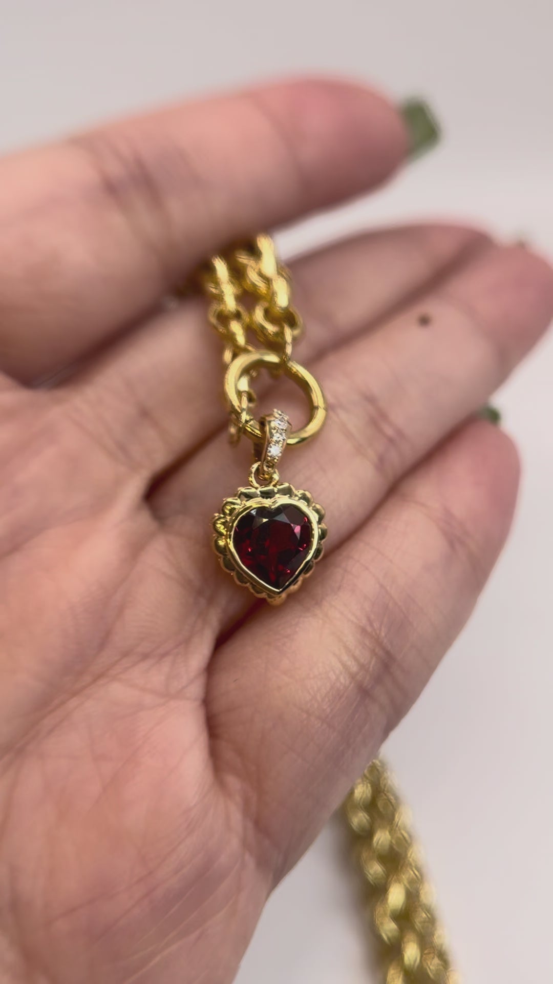 Found Gaud! A brand new, rich red heart-shaped garnet takes center stage in this scalloped bezel pendant, suspended from a diamond studded bail. Set in luminous 18K gold, this piece pairs bold warmth with delicate sparkle, perfect clipped onto your favorite chain.