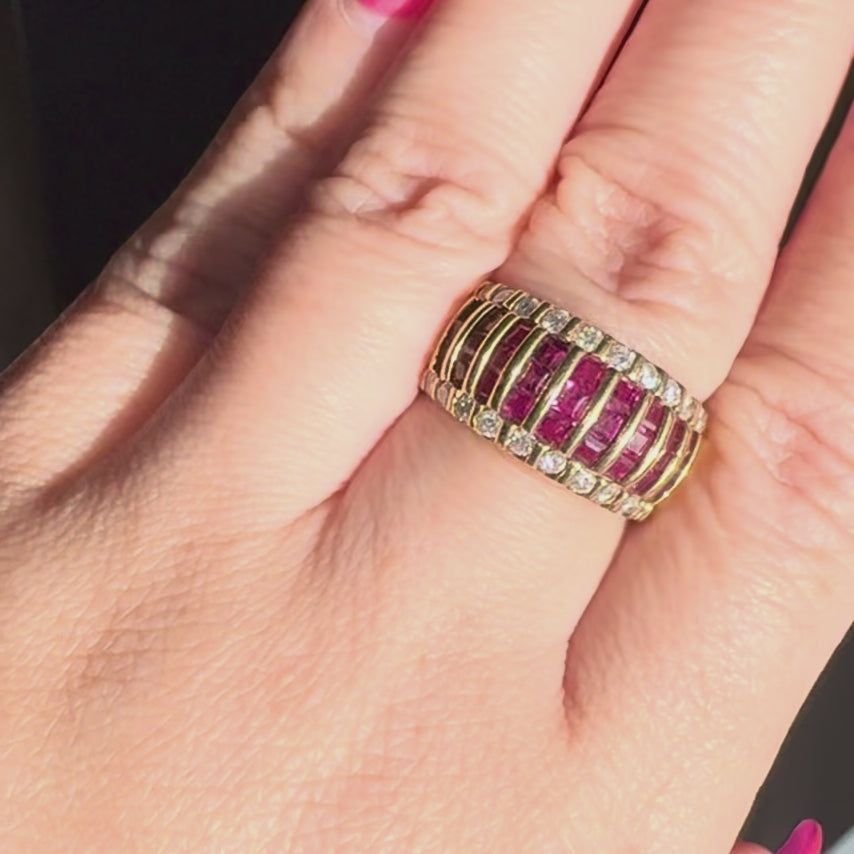Estate find, 18K bombe type ring set in natural rubies and diamonds.